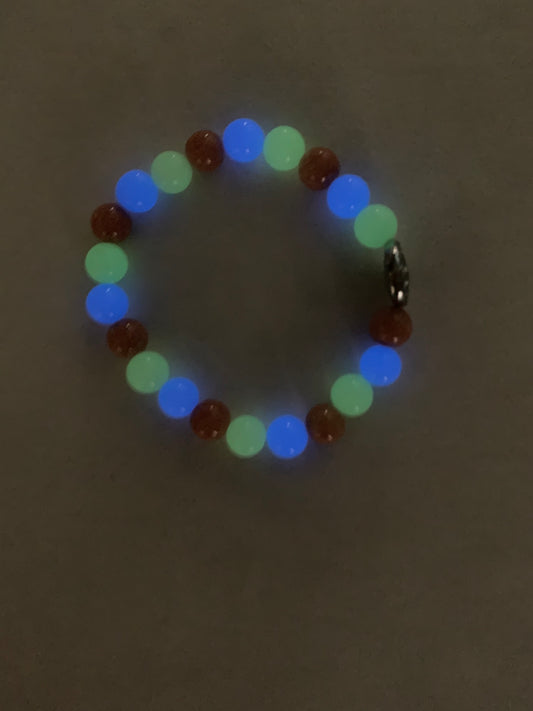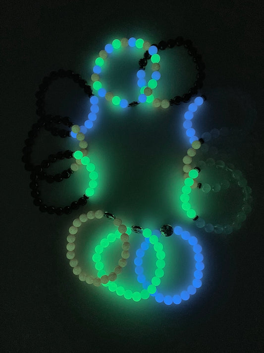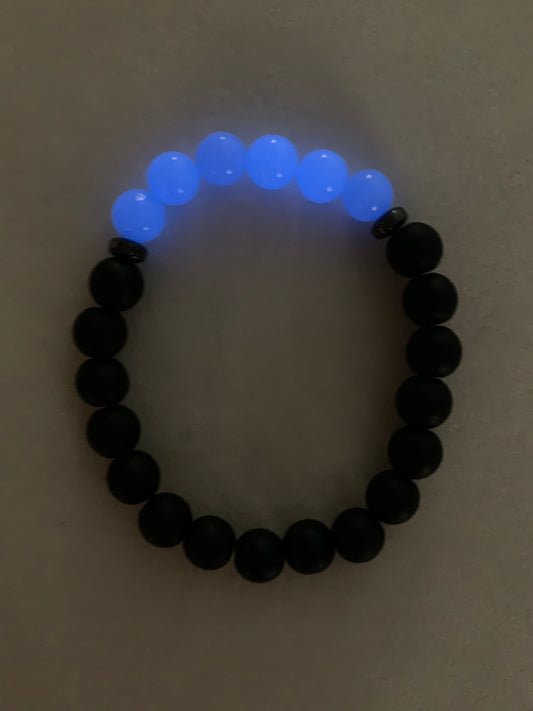Aragonite Blue with Onyx Bracelet 8 mm Round Beads - Naturally Glows in the Dark