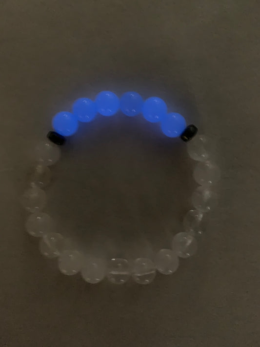 Aragonite Blue with Clear Quartz Bracelet 8 mm Round Beads - Naturally Glows in the Dark