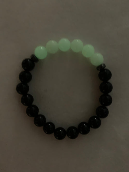 Aragonite Green/Yellow with Onyx Bracelet 8 mm Round Beads - Naturally Glows in the Dark