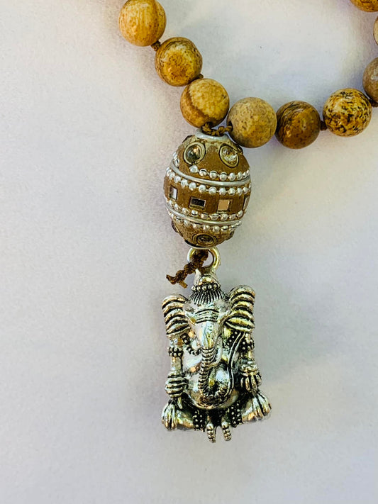 Nisaba Mala - Worldly Knowledge - Picture Jasper, Elephant Beads and "Tassel," Tibetan Guru